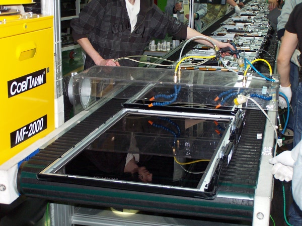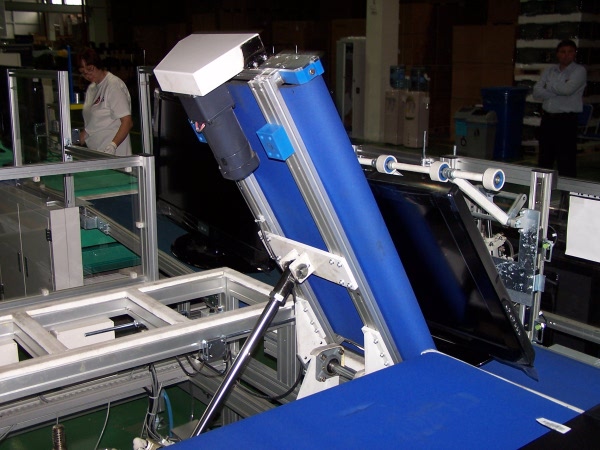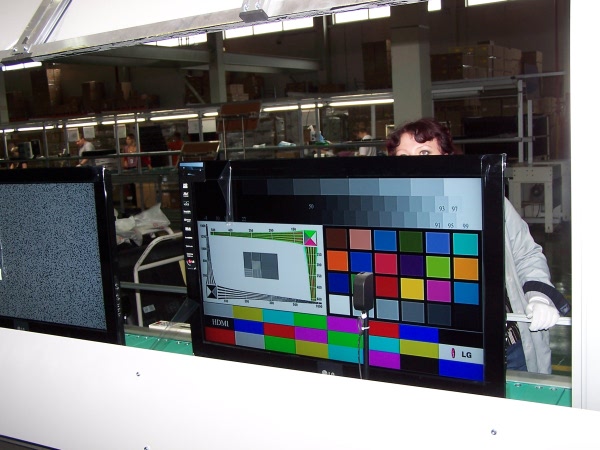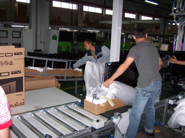 Сначала комплектующие кладутся на ленту конвейера. После укладки лицевой части укладывается модуль, не имеет значения какого типа телевизор, жидкокристаллический или плазма. После укладки модуля прикручивается блок питания и главная плата(шасси). Конвейерная лента имеет мягкое резиновое покрытие, так что телевизор можно класть непосредственно на нее, не боясь возникновения царапин. Собранный телевизор поступает на специальное устройство, которое автоматически ставит его в вертикальное положение и переносит на другую ленту. Дальше идут настройка и тестирование. Розетки для питания телевизора во время этих операций встроены непосредственно в конвейерную ленту. Успешно прошедшие тестирование телевизоры поступают на упаковку. Конвейер завершается в соседнем помещении, где находится склад.