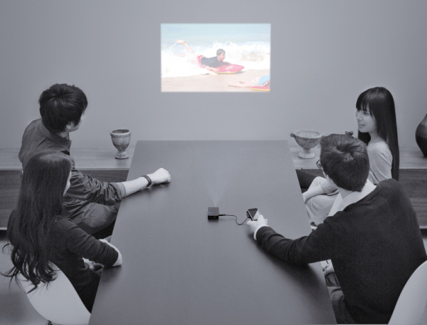 Данное устройство идеально подойдет к вашему телефону, на нем можно просматривать видео, фотографии, фильмы, а также документы. Встроенная батарея обеспечивает непрерывную работу в течение 130 мин и способна полностью заряжаться менее чем за 110 минут. Размеры проектора составляют 50×112×18.3мм, а вес равен 128г.
