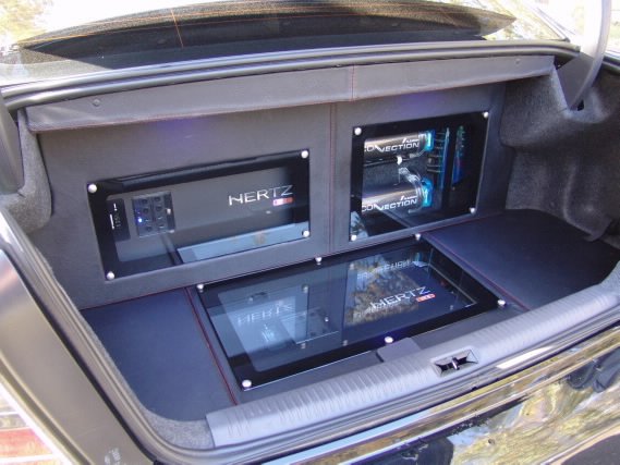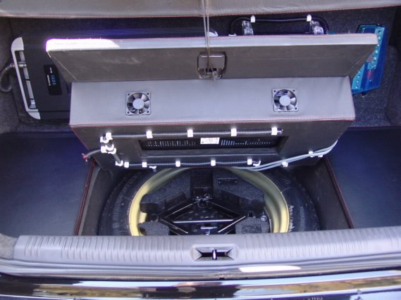 После установки подиума, изготовили фальш-панель и подиум под усилитель HERTZ HP 4. Усилитель поместили в закрытый ящик. В ящик врезали 4 вентилятора, 2 приточных и 2 вытяжных. Вентиляторы управляются термодатчиками усилителя. Также сделали подиум для подсветки. При открывании крышки багажника она включается и багажник заполняется неоновым светом. Усилители и конденсаторы, также излучают неоновую подсветку.