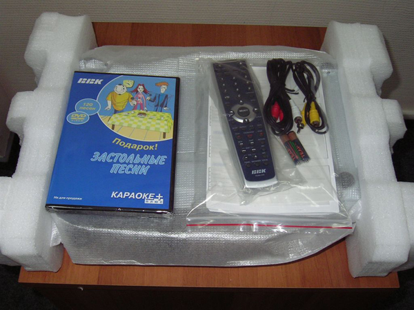 Потребительские свойства. Проигрыватель упакован в коробку стандартных размеров в фирменных светло-синих тонах. На упаковке есть ручка. Надо заметить, что все надписи выполнены на русском. В комплектацию входят сам плеер, пульт дистанционного управления, батарейки к нему, инструкция на 2-х языках, включая русский (не очень подробная, но понятная), гарантийный талон, два соединительных кабеля, диск караоке на 120 песен. Пульт ДУ выполнен из пластика серебристого цвета, передняя панель окрашена в чёрный цвет; можем отметить, что он не понравится людям со слабым зрением – надписи выполнены очень мелко.
