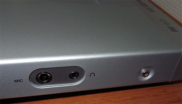 Справа на передней панели находится кард-ридер и USB вход, закрытые маленькой откидной панелькой, а с правого боку расположились микрофонный вход (караоке) и выход на наушники.