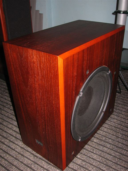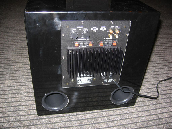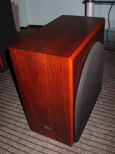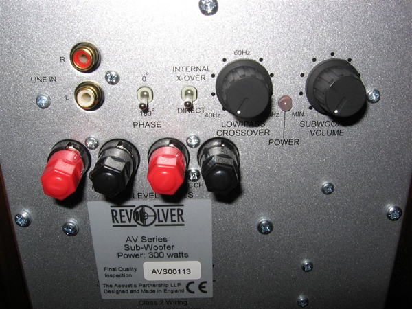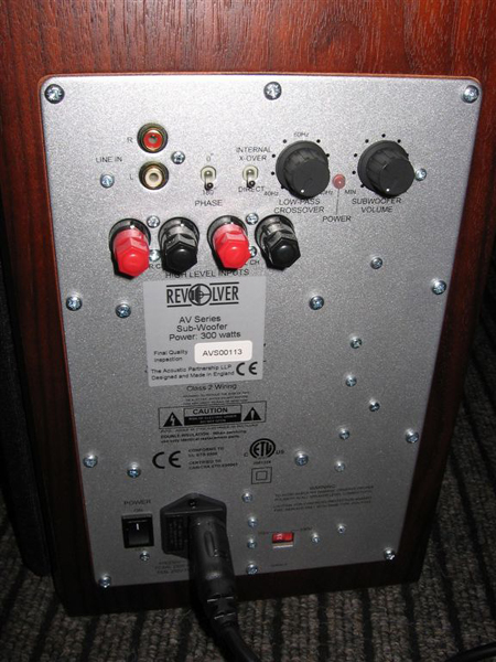 Третьим «испытуемым» стал Revolver AVS. При первом взгляде на него возникла мысль «Что он может, по сравнению с теми двумя гигантами?!», но прослушивание моментально изменило моё мнение. Впрочем, обо всём по порядку. Корпус Revolver AVS, как и остальных сабвуферов, выполнен из MDF, но его размеры – 40х21х38 см. Вес составляет 17 кг. Отделанный натуральным шпоном, Revolver AVS выглядит очень дорого и красиво. Динамик схож с Jamo, вплоть до материала мембраны. Частотный диапазон 30-200 Гц. Мощность усилителя 300 Вт.