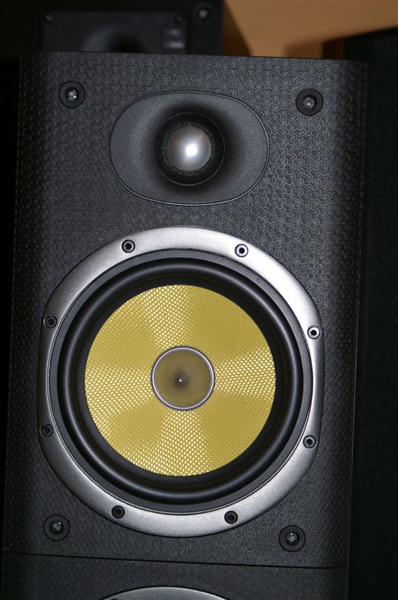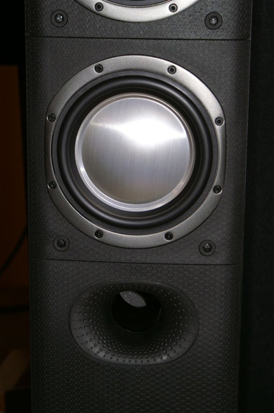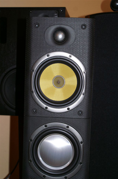 У DM603S мы можем увидеть следующие «движители звука»: фирменный 25 миллиметровый алюминиевый купол, классический жёлтого цвета кевларовый 165-мм среднечастотник и уникальный в своём роде серебристый 165-мм низкочастотный динамик, с алюминиевым купольно-коническим диффузором (мембрана сделана из бумаги с алюминиевыми волокнами). Последний ответственен за хороший и отлично прорисованный бас, но об этом ниже. Колонка имеет два фазоинверторных порта (естественно оба выполнены по фирменной технологии FlowPort™), басовый – снизу на передней панели, и СЧ/ВЧ - сверху сзади. Также следует упомянуть что басовая и СЧ/НЧ секции в корпусе изолированы друг от друга жесткими распорками из MDF.