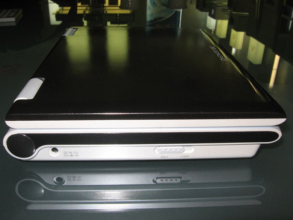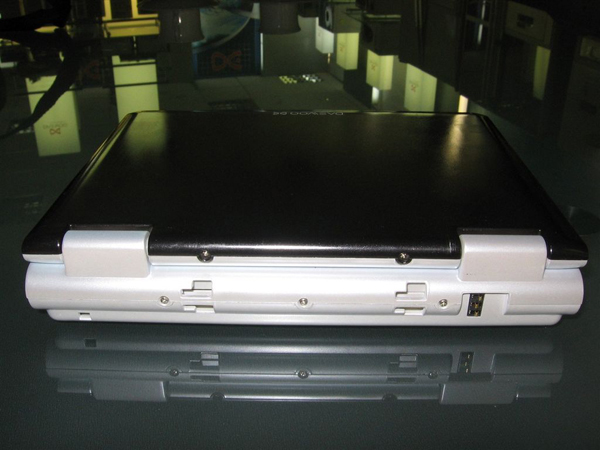 Ну что ж, а вот и главный герой собственной персоной! Экстерьер выполнен в чёрно-серебристых тонах (но есть и другие цветовые решения). Внешне Daewoo DPC 7700 PD напоминает эдакий детский ноутбук. Спереди находится удобная защёлка опять же, напоминающая ноутбучные, она предостерегает плеер от случайного открытия. На левой боковине расположился разъём для подключения внешнего питания и выключатель. О нём хочется сказать отдельно пару слов. Реализован он механическим ползунком, который можно вполне и не выключать, это с одной стороны плюс, с другой же, можно просто о нём забыть и разрядить в ноль аккумулятор.