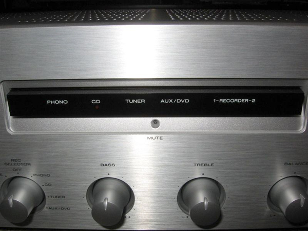 Теперь об усилителе. По центру передней панели Marantz PM 4001 расположился небольшой тёмный экран, на котором находятся светодиоды, индицирующие режим работы усилителя. Ниже расположились основные органы управления. По краям лицевой панели видим две ручки большого размера, отвечающие за переключение источника сигнала и регулировку громкости.
