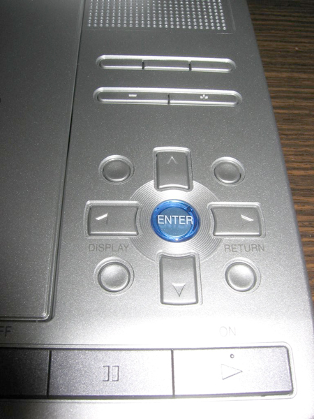 Пульт ДУ серебристого цвета, выполненный из хорошего, качественного пластика, такой же удобный и компактный, как и сам DVD-плеер. Стандартные кнопки: воспроизведения, выключения, числовые, регулировки громкости, введения субтитров, навигации в меню и другие. Но, на мой взгляд, пультик – это просто бесплатное приложение к проигрывателю, можно обойтись и без него, потому что, вряд ли кто-то будет смотреть фильм на расстоянии более чем метр. Открываем верхнюю крышку проигрывателя, вверху с обеих сторон видим два встроенных динамика, справа внизу удобные кнопки управления меню. Для открытия дискового отсека нажимаем Open, вставляем диск и запускаем его. Что ж, качество картинки вполне удовлетворительное. Насыщенная цветовая гамма и четкость радует глаз. Изображение (яркость и цвет) на мониторе можно регулировать. Вот только шрифт на экране очень мелкий и разобрать его нелегко и исправить это никак нельзя.