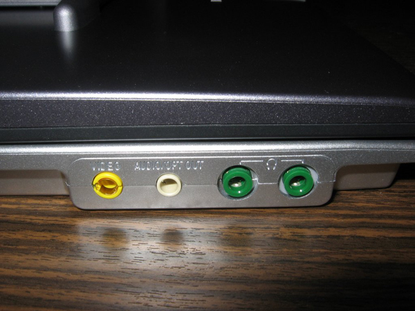 Перейдем к более тесному общению с японским малюткой. Сзади к проигрывателю прикрепим литий-ионный аккумулятор, который обеспечивает шесть часов автономной работы - устройство можно смело брать с собой в дорогу, не беспокоясь о повторной подзарядке. В крайнем случае, с помощью автомобильного адаптера можно подключить аппарат к гнезду прикуривателя в машине. На левом боку плеера расположен разъём для подключения питания. Здесь же находятся и интерфейсные разъемы. Благодаря видеовыходу, проигрыватель можно подключать к телевизору, а два гнезда для подключения наушников позволит кино смотреть вдвоем. Необходимо заметить, что композитный выход не стандартный RCA, а собственный, но в комплекте присутствует переходник.