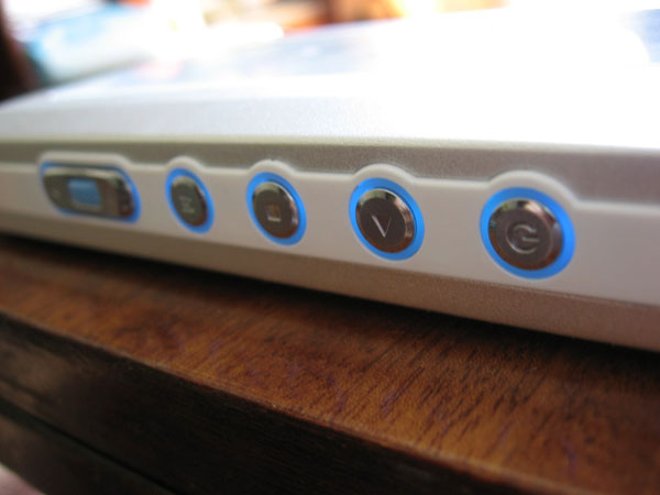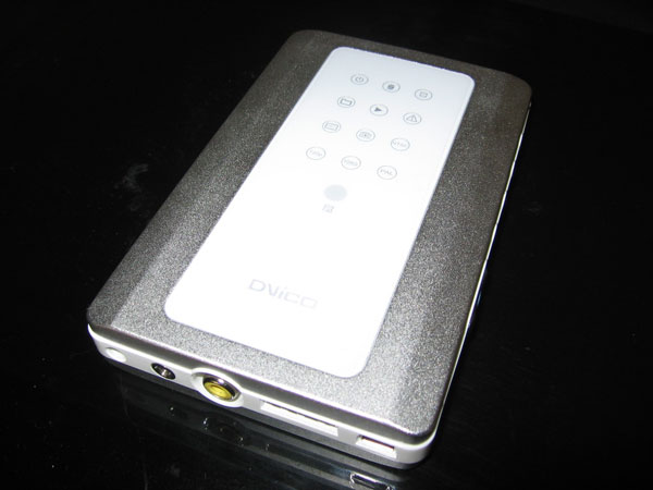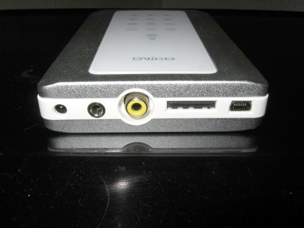 В небольшой коробке помещаются само устройство, пульт ДУ и аксессуары: A/V - кабель, USB- кабель, USB-OTG переходник, блок питания, видео и аудио адаптеры, а так же CD с утилитами и описание на русском языке. Одно из главных достоинств этого плеера – вес 180 г (включая жёсткий диск) и размер (82x127,5x20 мм). Привлекательна малютка и внешне – элегантный алюминиевый корпус серебристого цвета с белой окантовкой. Когда аппарат работает, светящиеся в темноте синим цветом иконки и кнопки, придают плееру особенную прелесть. На боковой стороне устройства расположены основные клавиши управления.