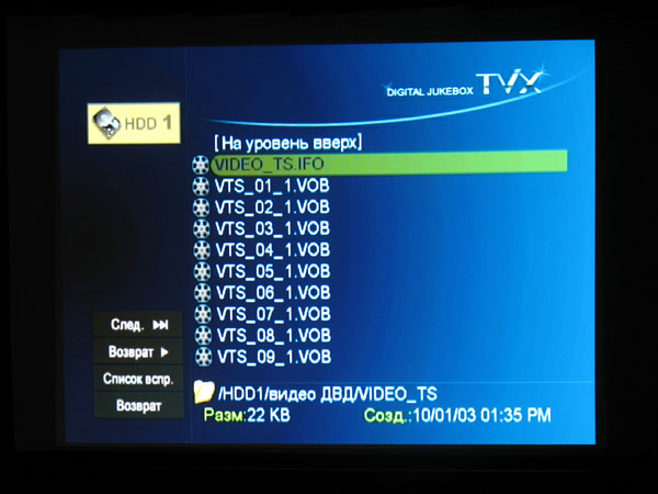 Теперь немного о самой работе устройства. При первом подключении, нужно выбрать по какому интерфейсу идёт сигнал. Это делается очень легко по нажатию клавиши Video Out на пульте ДУ. Когда на телевизоре появилась картинка, то всё готово к работе. И работа это очень приятна! Разработчики, кажется, предусмотрели почти всё, например, чтобы воспроизвести всё содержимое папки, будь то коллекция фотографий или музыка, нужно просто навести курсор на папку с нужным содержимым и нажать на Play. Всё! TVIX услужливо воспроизведёт контент. А если Вам требуется показать отдельную фотографию, просто наведите на неё и нажмите ОК. Плеер умеет и «зумировать» фотографии и поворачивать их? Хоть, пока, и не автоматически.