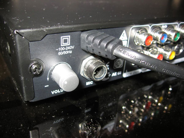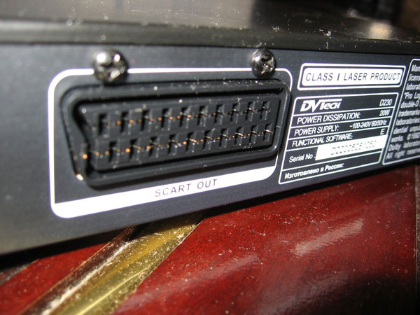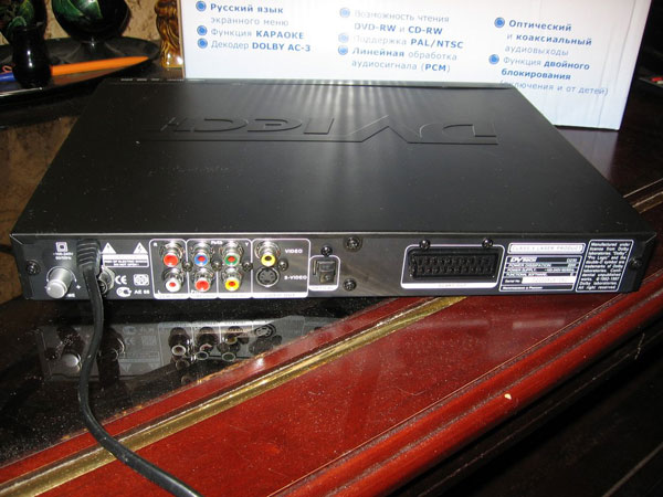 DVD проигрыватель DVTech D 230 – легкий (вес 1,6) и компактный (320x40x250). Благодаря аккуратному дизайну идеально впишется в любой интерьер, выпускается в трех вариантах расцветки корпуса – черного, белого и серебристого. На передней панели расположен лоток дископриемника, который плавно выдвигается при нажатии кнопки Open. Механизм мягкий, однако, лоток выдвигается не до конца, поэтому вставлять диск не так удобно, но это дело привычки. Здесь же находятся основные кнопки управления. Кнопка выключения светится красным светом, когда проигрыватель в режиме ожидания и зеленым, когда плеер работает. Сзади расположились тумблер электропитания, интерфейсные разъемы – композитный, компонентный, S-video, SCART видеовыходы и коаксиальный, стерео, оптический аудиовыходы, а также разъем для подключения микрофона и регулятор его громкости, что говорит о наличии функции караоке. За обработку звука в проигрывателе отвечает 24-битный аудио процессор с частотой сэмплирования 192кГц. Видео процессор на базе чипа МТК 1389 имеет частоту обработки видеоданных 108 МГц и глубину цвета 12 бит. Проигрыватель оборудован встроенным декодером Dolby Digital, поддерживает системы цветности Pal и NTSC с изображением в форматах 4:3 и 16:9.
