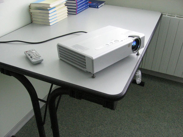 Идущая в комплекте с проектором, программа достаточно функциональна и позволяет пользоваться различными тонкостями, например, любое изображение во время презентации можно зафиксировать, сохранить в памяти и вывести на левую сторону экрана для сравнения, параллельно продолжая демонстрацию на правой стороне. Еще присутствует функция беспроводного суфлера, которая позволяет видеть на экране компьютера, кроме самой презентации (которая в этот момент отображается на большом экране для всех) пометки или другие данные, доступные только вам. В расширенном режиме индексного окна проектор может отображать данные с нескольких компьютеров (до 16) и проецировать их на экране, выделяя каждому «своё» место. Выбрав пиктограмму пультом, вы можете сделать одну из картинок главной и увеличить ее на весь экран. Кроме того, присутствует функция передачи ограниченной зоны изображения. Устройство способно передавать не только видеофайлы, но и звук. Здесь стоит сделать одно замечание – возможности беспроводного канала не позволяют передавать видео с высоким битрейтом (например, dvd-video), но расстраиваться не стоит, поскольку возможность проводного подключения никто не отменял, да и назначение Panasonic PT –LB55NTE не кинотеатральное. Звуковой динамик один.