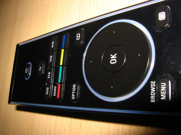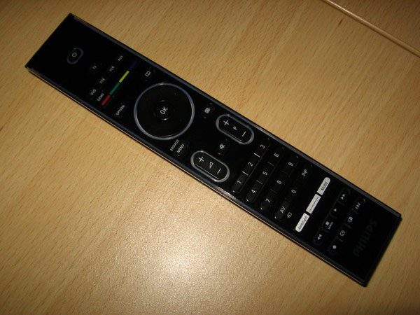 Пульт ДУ очень оригинальной формы – сужающийся к передней части клинком, стильный, увесистый, черный и имеет покрытие «под лак». Он не только симпатичен, но и удобен. Несмотря на то, что ходы кнопок невелики, нажатия очень информативные. В комплект поставки Philips 42PF9831D входит не только подставка, но и настенный крепеж.