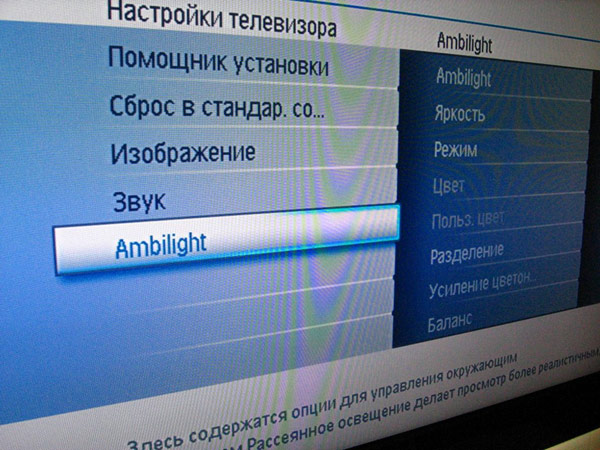 Необходимо отметить, что Philips 42PF9831D - первый телевизор с реализацией 4 поколения фирменной технологии Ambilight. Раньше панель нужно было ставить близко к стене, и цвет поверхности (обоев или краски) естественно влиял на реализацию функции. Теперь же все стало гораздо проще и эффектней. А реализуется это «фишка» достаточно просто и изящно – RGB лампы способны выдавать любой оттенок, а срок их службы примерно равен сроку службы самого телевизора.