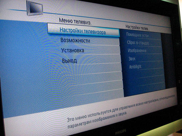 Немного цифр: формат экрана 16:9, контрастность 4500:1, угол обзора, ставший уже стандартным - 176 градусов по вертикали и горизонтали. В модели используется активная матрица последнего поколения – TFT с разрешением WXGA (1366х768). К достоинствам телевизора можно отнести также антибликовое покрытие экрана. Богатое меню грамотно русифицировано. Здесь можно активизировать большое количество настроек – отрегулировать звучание и изображение, формат экрана (присутствует 6 широкоэкранных режимов).