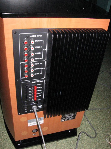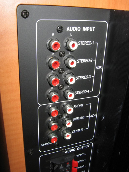 Начать описание DVTech AA 1660 стоит, пожалуй, с сабвуфера. Именно он в этой компании главный. В нём встроен собственный усилитель и усилитель на все 5 сателлитов. Сзади саба, расположен массивный радиатор, который отводит тепло. Надо сказать, что даже после усердного тестирования на разных громкостях и с всевозможными настройками, он остался чуть теплым, так что за перегрев в большинстве случаев беспокоиться не стоит – главное не ставить сабвуфер вплотную к стене (это же условие необходимо и для правильного восприятия звука). Кроме радиатора, сзади находятся коммуникационные разъемы для подключения источника сигнала. Имеется возможность принять сигнал от одного источника 5.1 (все RCA разъемы) и от 4 стерео (2 RCA на каждый вход).Ниже располагаются выходы на сателлиты. В комплект акустики входят достаточно качественные провода, которых более чем достаточно для небольших колоночек.