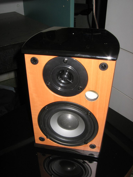 Крепления кабелей везде – пружинные. Передняя панель сабвуфера располагает дисплеем, кнопками управления, а под «монитором», находится отверстие фазоинвертора. На дисплее во время работы отображается импровизированный эквалайзер, выбранный источник, а так же некоторые другие настройки. А главное – большой (250 мм) динамик сабвуфера расположен снизу. Теперь немного о сателлитах: очень аккуратненькие, добротные 2-х полосные колоночки. Среднечастотный динамик имеет диаметр 76 мм. А вот 25-мм твитер немного смутил – он пластиковый, знакомый по многочисленным мультимедийным колонкам. Фазоинвертор выведен на переднюю панель сателлитов, что предполагает крепление колонок к стене. И действительно, разработчики предусмотрели специальные крепежи. Мощность сабвуфера – 130 Вт, сателлитов – 30 Вт (RMS). У комплекта есть удобный пульт ДУ, с которого, валяясь на диване можно, например, отрегулировать громкость.