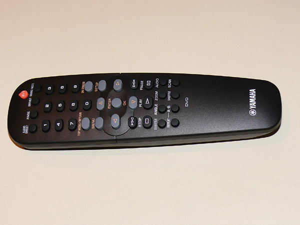 Пульт проигрывателя Yamaha на вид более эргономичен, выполнен в форме лопаточки. Держать его в руке очень удобно, он прямо таки растворяется в ладони, а большой палец сам ложится на курсор с кнопкой ОК в середине. Но должен сказать, что на этом эргономика заканчивается. Пульт небольшой и поэтому кнопки на нем расположены достаточно плотно, размером и формой они не отличаются друг от друга, рабочие зоны слиты воедино. При определенном опыте работы с данным устройством, конечно же, выработаются привычки, и проблем не будет, но поначалу приходится постоянно выискивать на пульте нужную кнопку.