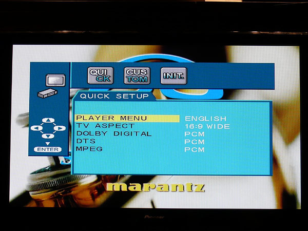 Главное меню проигрывателя содержит три раздела: «быстрые настройки», «пользовательские настройки» и «режим инициализации», служащий для первоначальной конфигурации устройства. Подобный подход – ни что иное, как попытка упростить процесс знакомства и работы с проигрывателем. Могу сказать, что попытка удачная, меню «быстрых настроек» содержит все настройки необходимые для согласования с телевизором и аудио аппаратурой. Основной раздел меню, «пользовательские настройки» включает в себя типичные подразделы – настройки языка, аудио и видео части, блокировки от детей и дополнительные настройки. Все вполне стандартно, доступно, понятно даже в англоязычном варианте меню, которое, увы, как раз-таки и не русифицировано.
