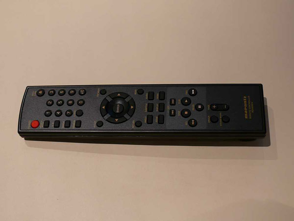 Пульт дистанционного управления проигрывателя Marantz имеет классическую форму, его края немного закруглены и, наверное, поэтому он так неожиданно удобно лег в руку. Очень понравилось решение с оформлением курсора. Кнопка enter находится в небольшом углублении. При такой компоновке кнопки направлений нажимаются боковой частью подушечки пальца - это оказалось очень удобно. Все основные опции проигрывателя имеют соответствующие кнопки на пульте. При этом не могу сказать, что пульт перегружен кнопками, наоборот, они расположены на достаточном удалении. Рабочие зоны четко отделены друг от друга. Оригинально расположены кнопки управления воспроизведением, таким образом, их практически невозможно перепутать. В общем, этот неприметный и простой, на первый взгляд, пульт показал чудеса продуманности и эргономики.