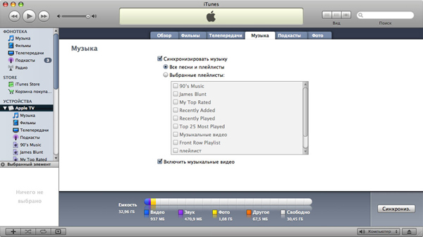 На коробке Apple TV красуется надпись «Mac + PC», и его работа согласуется с компьютерами под управлением операционных систем не ниже Mac OS X 10.3.9 или Windows XP. Правда, тут надо сразу оговориться, что поддержка осуществляется лишь при наличии iTunes версии 7.1 или еще более поздней. Но с другой стороны, все эти версии скачать из сети никаких проблем не составляет, все бесплатно. Apple TV оснащен процессором Intel, жестким диском емкостью 40 Гб, сетевым контроллером 10/100 Ethernet, портом HDMI, компонентным видеовыходом, а также портом USB 2.0 для диагностики и обслуживания. Все это втиснуто в плоскую коробочку весом в килограмм. Поддерживается воспроизведение файлов в форматах H.264, MPEG-4, AAC, MP3, AIFF, WAV, JPEG, BMP, GIF, TIFF, PNG. Согласитесь совсем не слабые параметры системы.