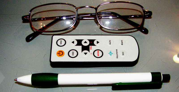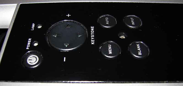 Управление проектором достаточно простое и надежное пульт меню выполнен в форм-факторе «кредитка» хотя на нее не сильно похож, так как, чуть уже кредитной карточки, и чуть короче ее. На пульте 12 кнопок расположенных в два столбика по 6 кнопок, при этом большая их часть отдана под управление главным меню, а четыре кнопки «джойстика» располагаются нетрадиционно Т-образно.