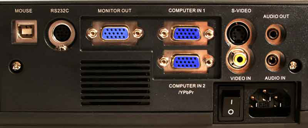 У проектора строго прямоугольная форма, декоративно округленная на краях, основной цвет приглушенный металлик, со вставками черного цвета. Дизайн лаконичен и строг, с претензией на изыск. Компоновка вполне традиционная, регулировочные кольца объектива расположены в выемке на верхней панели проектора. Кольца тонкие, но с глубоким накатом и управляются легко. За выемкой регулировки объектива находятся кнопки управления на корпусе, и главная из них выполненная в виде четырехпозиционного джойстика. Коннектная площадка несколько нетрадиционно находиться с правого бока а на самой площадки поначалу поражает обилие интерфейсов D-Sub, их целых три штуки, но читая подписи к ним понимаешь, что они вполне уместны здесь, так как выполняют большинство соединений необходимых для презентации или учебного процесса.