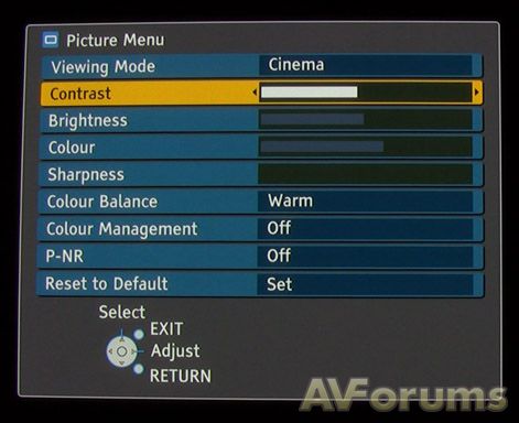 На верхней строке меню расположена настройка Режим Просмотра (Viewing Mode), которая может переключаться между режимами: Спорт (Dynamic), Стандартный (Normal), Кино (Cinema) и Природа (Eco). При калибровке мы используем, как базовый, режим Кино, потому что он обеспечивает наибольшую верность. В каждом режиме просмотра можно настраивать Контрастность, Яркость, Цвет, Четкость и опцию для выбора Цветового баланса (предустановка шкалы серого). Здесь есть также расширенное управление цветом (Colour Management) (правда, не настолько эффективное, как это звучит) и опция «P-NR» (шумоподавление). Есть также скрытый в меню Установки переключатель Вкл/Выкл для режима переразвертки изображения - Picture Overscan.