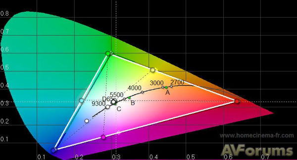 Хотя показатели шкалы серого не столь совершенны, обратим внимание на уровень дельта ошибки (розовая линия) и отметим, что действительно видимая находится много выше! Превосходной была и яркость, отмеченная плоской гамма-характеристикой (означающей, что темные зоны на самом деле выглядят как темные, а светлые, как светлые). После калибровки верность воспроизведения еще более повысилась, о чем свидетельствуют плоская линия RGB, совпадение цветов и вдобавок превосходная гамма-характеристика: