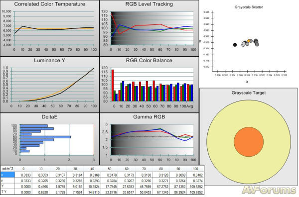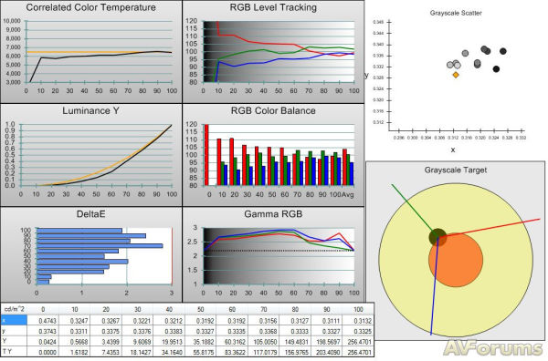 Много лучше были результаты для кривой шкалы серого. Хотя этот график - RGB Level Tracking и выглядит не очень выразительно, но всегда обращайте внимание на масштаб и отметите, что реальное отклонение лишь несколько процентов. Большая часть ошибок находится ниже уровня 2 и только одна выше 2! Такой результат означает невозможность увидеть погрешности на экране, по крайней мере, заметны они могут быть лишь в тестовой таблице.