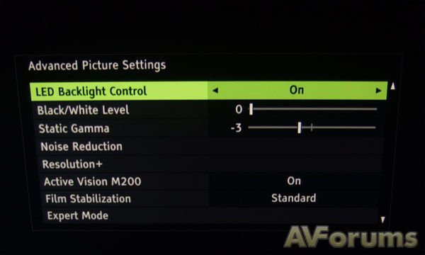 Несколько необычно основное экранное меню. После нажатия на дистанционном пульте кнопки «MENU» сразу же появились все основные регуляторы изображения. Перейдя в расширенное меню, можно найти опцию включения системы управления цветом «3D Colour Management System», а затем изменяемую после включения системы 3D CMS опцию разрешения работы датчика автоматической настройки яркости изображения. Здесь же можно включить/отключить технологию местного затемнения - регулятор называемый «LED Backlight Control». При отключении этой опции все источники подсветки зажигаются одновременно, что аналогично стандартным телевизорам с задней подсветкой на CCFL лампах.