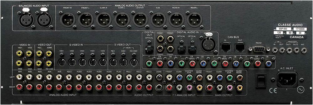 SSP-600 оборудован комплектом аналоговых симметричных (т.н. балансных) стереовходов и 7.1 выходов профессионального стандарта XLR для подключения к усилителю мощности. Для работы этого интерфейса предусмотрен дополнительный аналоговый источник питания (основной блок питания выполнен по импульсной схеме).