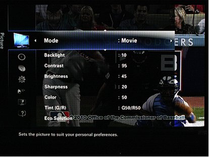 В этом году Samsung формально использовал систему параметров настройки изображения LG. Основной набор настроек включает новую систему из десяти пунктов, которая работает неплохо, хотя и не так хорошо, как у LG. Усовершенствованная технология снижения дрожания работает лучше, чем у LG, но не так хорошо, как прошлогодняя система Samsung. Имеется несколько встроенных испытательных таблиц, а также красный, зеленый и синий цветовые фильтры для помощи при калибровке телевизора. Можно также более или менее интенсивными методами регулировать затемнение или изменить настройки вставки черного кадра, предусмотренной для уменьшения размытия. Подробнее об этом - см. Характеристики.