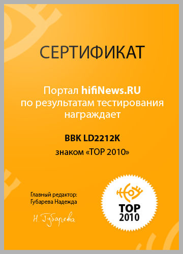 По результатам тестирования портал hifiNews.RU награждает ЖК-телевизор BBK LD2212K знаком TOP 2010.
