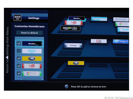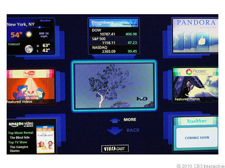 В моделях 2010 года Panasonic изменил внешнюю оболочку системы VieraCast, добавив такие виджеты, как Fox Sports и Twitter, а также опцию Skype (с конца мая 2010 года). Основное на наш взгляд изменение - ограниченные возможности настройки домашней страницы, что позволит вам наиболее удобно расположить часто используемые приложения и потоковые сервисы. Это можно сделать на первой, второй и третьей странице в любом из семи окон расположенных вокруг центрального окна на экране. Подобное переупорядочивание недоступно в интерфейсах интернет сервисов других производителей, не считая Vizio и виджеты Yahoo.