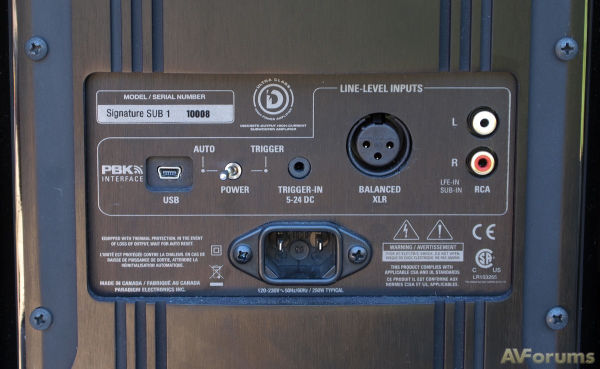 Для «раскачки» динамиков имеется встроенный усилитель мощностью 1700 ватт (3400 ватт пиковая мощность), рассеивающий при работе изрядное количество тепла. Звучание отличается большим уровнем громкости, а добиться высочайшего уровня качества помогает система коррекции звука под акустические особенности помещения. Для настойки этой системы в комплекте имеется набор под названием Paradigm Perfect Bass Kit. Вместо того чтобы выполнять эти установки вручную, Paradigm для вычисления оптимальных установок использует ваш компьютер, а потом просто загружает результаты в процессор усилителя через USB кабель. По существу остальные встроенные регуляторы нужны для регулировки усиления, частоты раздела фильтра, фазы атаки звука и задания функции автоматического включения/выключения. Непонятным может представляться отсутствие простого выключателя питания, но, с другой стороны, я ни разу не заметил, чтобы сабвуфер отключился при наличии на входе сигнала любого уровня. Так как даже в дежурном режиме сабвуфер выделяет изрядное количество тепла и потребляет электроэнергии авто отключение это большое преимущество.