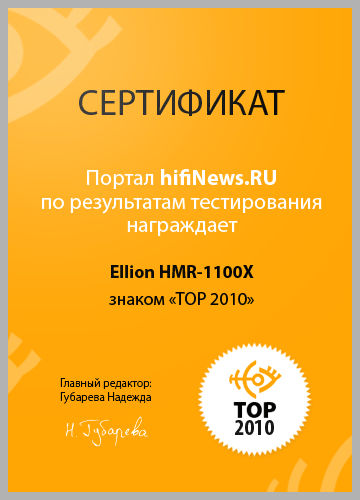 По результатам тестирования портал hifiNews.RU награждает медиаплеер Ellion HMR-1100X знаком "TOP 2010".