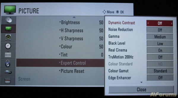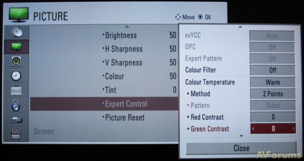 Регуляторы режимов Эксперт позволяют также выбрать цветовую температуру из Теплой, Средней и Холодной. Опция Теплый оказалась наиболее подходящей. Существует также регулятор Гамма, который обеспечивает выбор между значениями Низкий, Средний и Высокой, и здесь я нашел, что Средний лучше других приближает кривую гаммы к идеальному уровню 2,2. LG 47LD950 имеет 2-х точечный и 10-ти точечный регуляторы баланса белого цвета. Я использовал 10-ти точечный, который должен позволить очень точно откалибровать шкалу серого и цветовую температуру.