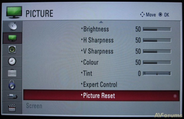 В меню режима изображения (Picture) имеются такие стандартные элементы управления, как Контрастность, Яркость, Горизонтальная и Вертикальная четкость, Цвет и Оттенок, которые доступны из всех предустановленных режимов изображения, а также есть возможность возврата к начальным установкам.