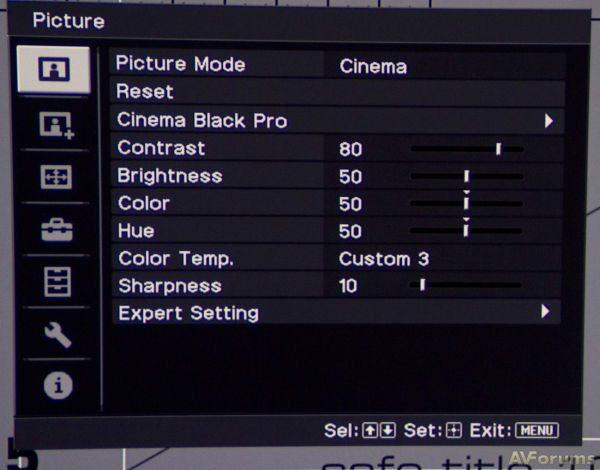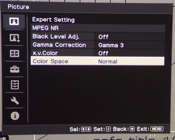 Система меню HW20 достаточно всеобъемлющая и ее, как правило, достаточно для настройки изображения в вашем домашнем кинозале. В главном меню, как и следует ожидать, имеется панель с регуляторами основных настроек изображения. Из заводских настроек изображения очень хорошим выбором является режим Cinema. Другие режимы выглядят более ярко, но за счет некоторой потери детальности изображения. Опция Cinema Black Pro управляет системой Auto Iris (автоматическая диафрагма) и позволяет выбирать точную или ручную настройку диафрагмы. Мы предпочли выключить эту опцию, чтобы не вносить дополнительных искажений в изображение, которые бы помешали оценить, на что же изначально способен проектор. Далее идут основные регуляторы изображения, опции для цветовой температуры (Colour Temp.) (баланс белого), где можно программно установить пользовательскую шкалу полутонов или выбрать предустановленный на заводе вариант. Следующее меню настроек для профессионалов – экспертные настройки.