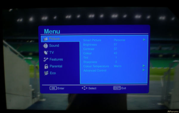 Главное меню изображения включает стандартные настройки: Контрастность, Яркость и Цветность, а также Оттенки и Резкость плюс настройки режима изображения и варианты цветовой температуры. Стоит отметить единственную предустановку Smart Picture, которую можно настроить индивидуально, но об этом чуть позже. Кроме того, возможно, стоит упомянуть, что резкость для HD источников лучше всего установить на значение 2, т.к. при меньшем значении появляется нежелательный эффект размытия краев.
