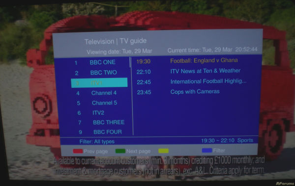 Электронная программа телепередач (EPG) Sharp представлена в довольно устаревшем визуальном интерфейсе и выглядит, откровенно говоря, плохо. На одной странице EPG восемь каналов, но при этом отображается только выбранный канал, что ограничивает ее реальную ценность для зрителя. Производителю действительно нужно переработать существующий вариант EPG. Кроме того, программа телепередач отображается только до полуночи, поэтому полуночникам придется нажать кнопку Следующий день, чтобы узнать, какие ужасы их ждут по телевизору поздней ночью или ранним утром.