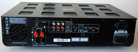 Несмотря на сравнительно компактные размеры, аппарат оснащен выходными усилителями на дискретных элементах. Преимуществом таких усилителей является высокий отдаваемый в нагрузку ток, что позволяет подключать к ресиверу акустику со сложной характеристикой импеданса, не опасаясь появления искажений звука. В качестве «платы» за это в ресивере установлен вентилятор охлаждения, которого, впрочем, практически не слышно даже в непосредственной близости от аппарата. Вентилятор смонтирован на радиаторе выходных транзисторов (последний имеет форму трубы прямоугольного сечения), поэтому работает весьма эффективно. Для питания ресивера используется крупный сетевой трансформатор на Ш-образном сердечнике и пара крупных емкостей – проверенное Hi-Fi-решение, в отличие от новомодных импульсных блоков питания.