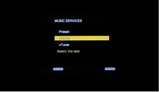 Например, функция навигации для интернет-радио (vTuner) невероятно утомительна. Если Вы ищете станцию, то можете видеть в меню только две из них, и вынуждены пролистывать список, чтобы увидеть следующие. И даже, когда вы, наконец, что-то запускаете, GUI показывает внизу прокручиваемое сообщение "Press DISPLAY to view the information." Несколько загадочное предложение, и нет никакой причины требовать нажатия кнопки DISPLAY для получения дополнительной информации о песне и исполнителе. (Когда Вы действительно нажимаете DISPLAY, отображаемая на экране информация состоит из 10 символов, остальные надо прокручивать). Slacker работает не лучше. Не отображается название альбома, что есть на конкурирующих моделях.