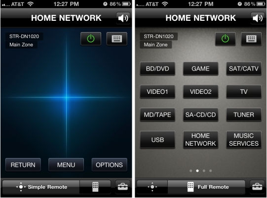 Sony STR-DN1020 может управляться через приложение Sony Media Remote, доступное для портативных устройств Apple и смартфонов на основе Андроид. В то время как другие производители создали приложения, специально разработанные для своих AV ресиверов, приложение Sony может управлять различной домашней AV техникой Sony, а не только STR-DN1020. Принимая во внимание то, что приложение Onkyo спроектировано так, что почти не приходится переводить взгляд со смартфона на графический интерфейс пользователя (GUI) на экране телевизора, функциональность приложения Sony больше напоминает реальный ПДУ, вынуждая Вас смотреть то на экран телевизора, то на смартфон. Поэтому постоянно им пользоваться, пожалуй, неудобно.