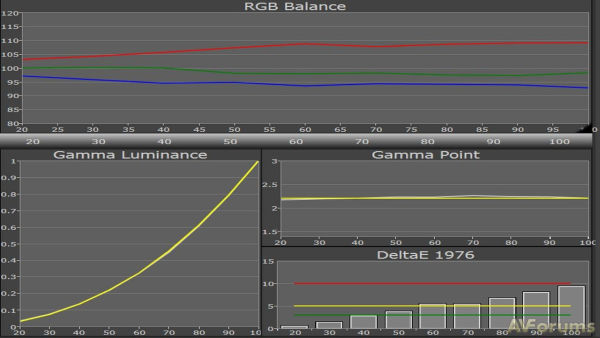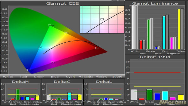 Это довольно хорошие результаты для первичных измерений LV550, и только смещение зеленого цвета может быть причиной какого-либо реального беспокойства и то лишь в незначительного. Все цвета были чуть «недосвеченными», но чтобы исправить их не нужно даже CMS. Мы вряд ли сможем в полной мере насытить синий цвет, но, опять же, это не может быть причиной для серьезного беспокойства.