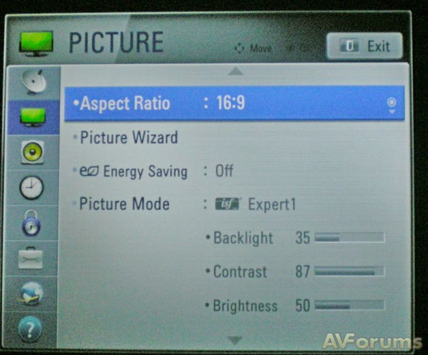 В меню изображения можно найти опцию для смены соотношения сторон экрана (Aspect Ratio) (для HD видео выберите Just Scan). Опция энергосбережения только затемняет картинку, поэтому была отключена. Режим изображения имеет варианты: Cinema, Game, Яркий и Стандартный, плюс два вышеотмеченных ISF режима Эксперт, которые предоставляют доступ к дополнительным регуляторам изображения, что позволяет создать наборы оптимальных параметров для дневного и вечернего просмотра.