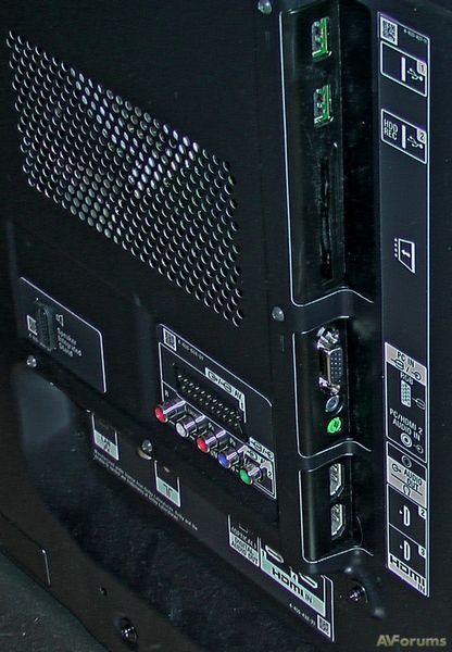 Сзади расположены 4 входа HDMI, два из них ориентированы вниз и два вбок. Боковая панель соединений смещена примерно на 16 см от бокового края лицевой панели, что должно обеспечить сокрытие от глаз зрителя подключаемых HDMI кабелей. Вниз обращены разъемы LAN, цифрового аудиовыхода и антенный. Sony не следует модной тенденции использования дополнительных адаптеров для подключения к соответствующим разъемам традиционных кабелей Scart, композитного и компонентного видео. Вместо этого на задней панели предусмотрены соответствующие разъемы в привычном виде. И наконец, сбоку есть разъем для наушников, подключения компьютера (с аудио разъемом), слот CAM и два порта USB, через один из них можно записывать воспроизводимое на экране видео.