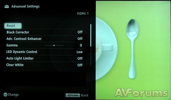 В дополнительных настройках изображения есть необходимые для калибровки регуляторы Баланса белого и Гаммы. Нет Системы управления цветом и остается надеяться, что ЖК панель будет воспроизводить точные цвета. У Sony HX853 есть безумное количество регуляторов, которые стоит отключить (или хотя бы понизить их воздействие), чтобы получить хорошую картинку. Главным среди них является «Live Colour», который на самом деле создает полный хаос в цвете. Из других регуляторов можно посоветовать отключить Black Corrector, Auto Light Limiter, Clear White, Live Colour, Detail Enhancer, Edge Enhancer и Skin Naturaliser. К счастью, выбор режима Кино автоматически отключает большую часть ненужной видеообработки, но мы нашли применение для Adv. Contrast Enhancer при калибровке и локальному затемнению LED Dynamic Control.