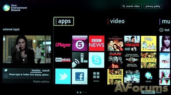 Широкий выбор сервисов в разделе приложений, включая Iplayer, Facebook и Twitter, есть десятки видео по заказу, включая Евроспорт, You Tube и Netflix. Пользователи последнего сервиса могут быть разочарованы тем, что нельзя настраивать изображение с помощью функции Motion Flow, которая, похоже, заблокирована в наиболее агрессивном положении Smooth. В потоком сервисе Sony 3D Experience стало несколько больше контента, есть различные виды спорта, видеоигры и сюжеты о природе, плюс музыкальные клипы, материалы о Гарри Поттере, материалы о путешествиях и "Всемирное наследие". Наряду с Panasonic, Sony, имеет сейчас преимущество в том, что компания связана с производством 3D материалов, а также разрабатывает и продает оборудование для съемки в формате 3D.