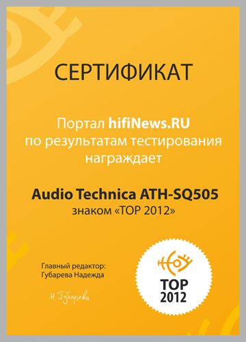 По результатам тестирования портал hifiNews.RU награждает Audio Technica ATH-SQ505 знаком "TOP 2012".